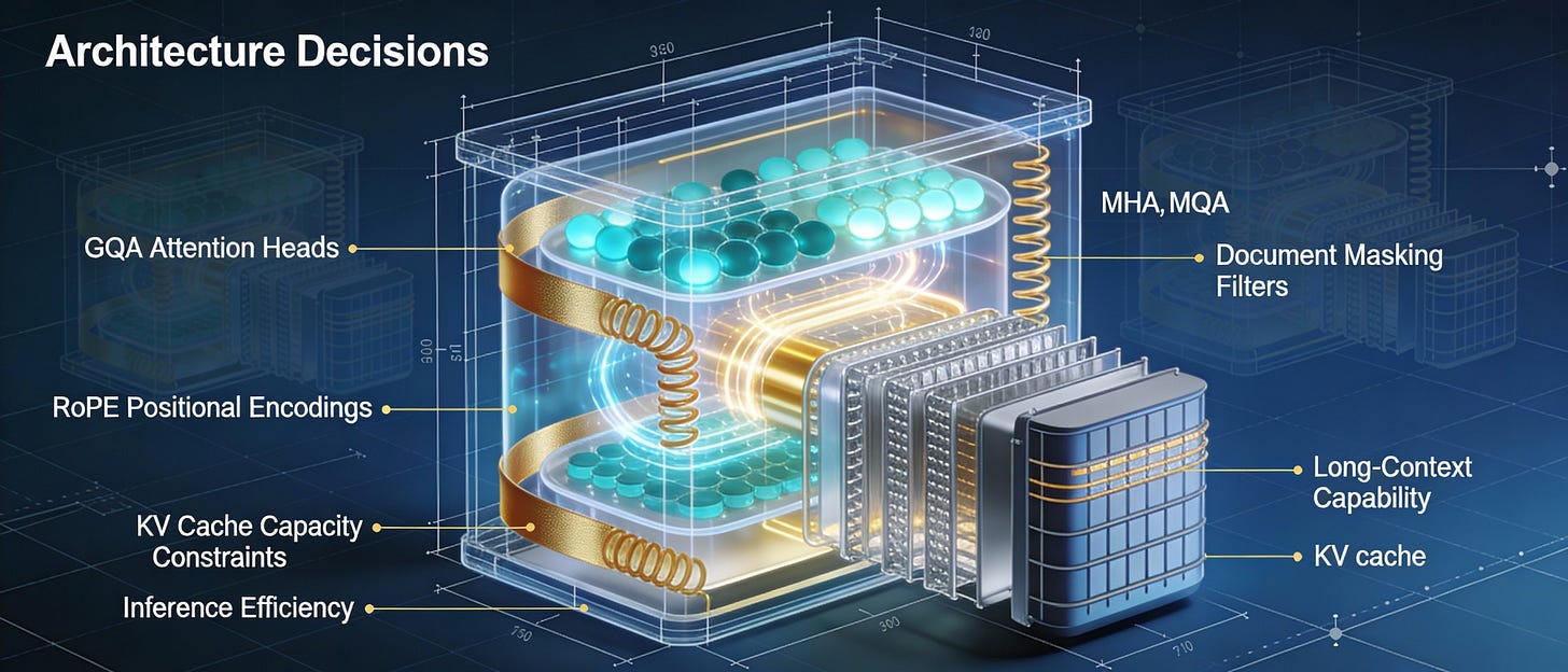 MLA (Multi-Latent): Compresses KV into latent space; theoretical efficiency gains. Implementation complexity; not adopted at 3B scale.