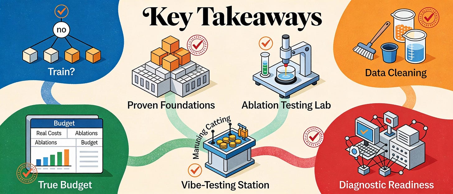 Budget for the real costs. Ablations and debugging can exceed half the main training cost. Scale reveals problems invisible at smaller sizes. Plan for training cost + ablations + surprise buffer. The buffer is not optional.