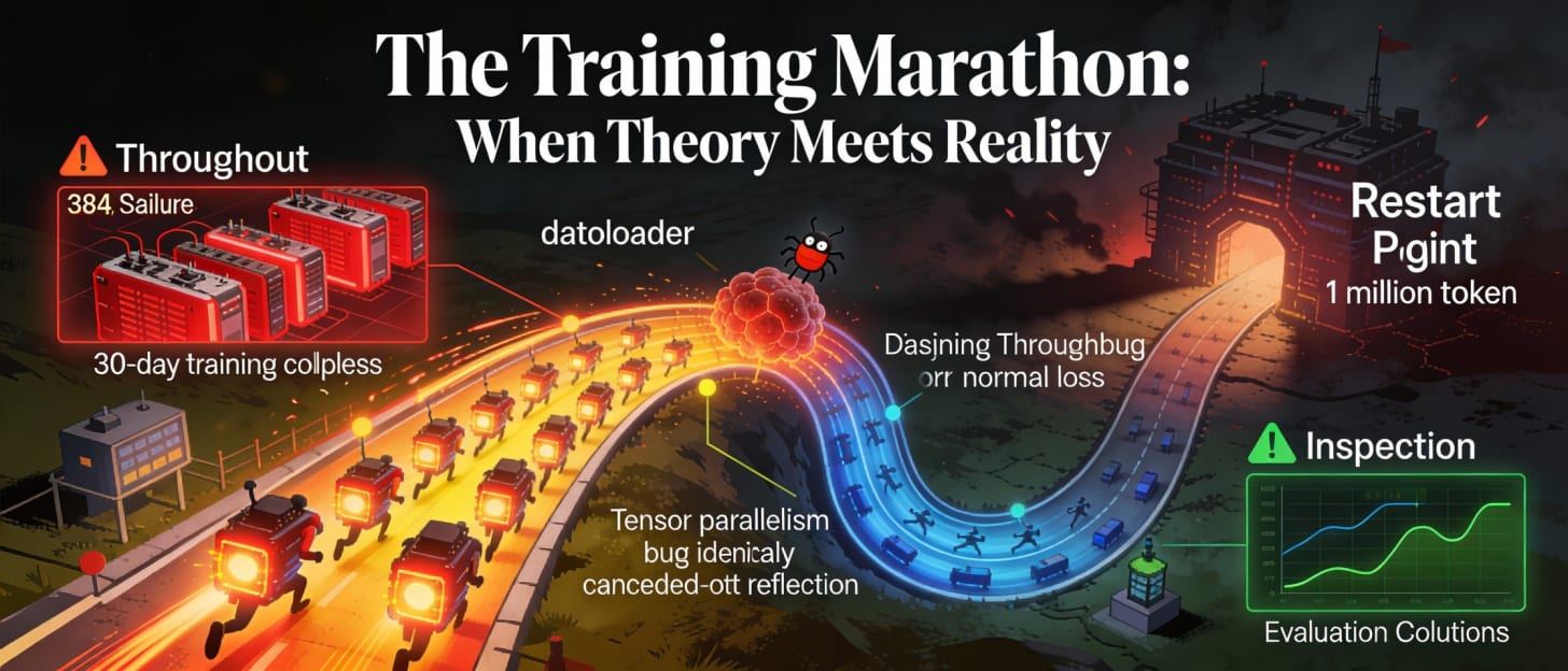 This is where the Playbook earns its reputation. The training marathon chapter reads like a thriller—problems that never appeared in smaller tests, scale-emergent failures invisible at ablation scale, and the gut-wrenching decision to restart after already burning through 1 trillion tokens.
